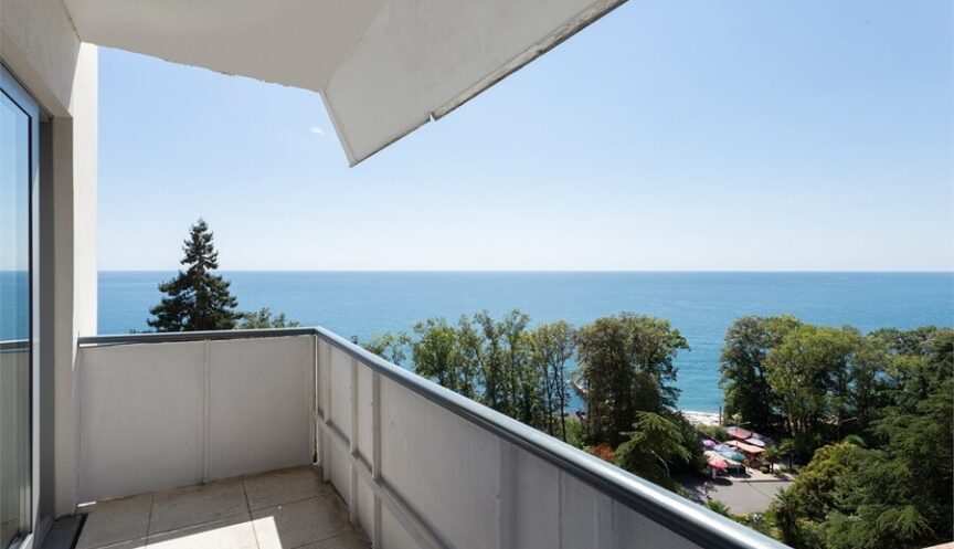 До собственного галечного пляжа 50 метров, спуск происходит на лифте.